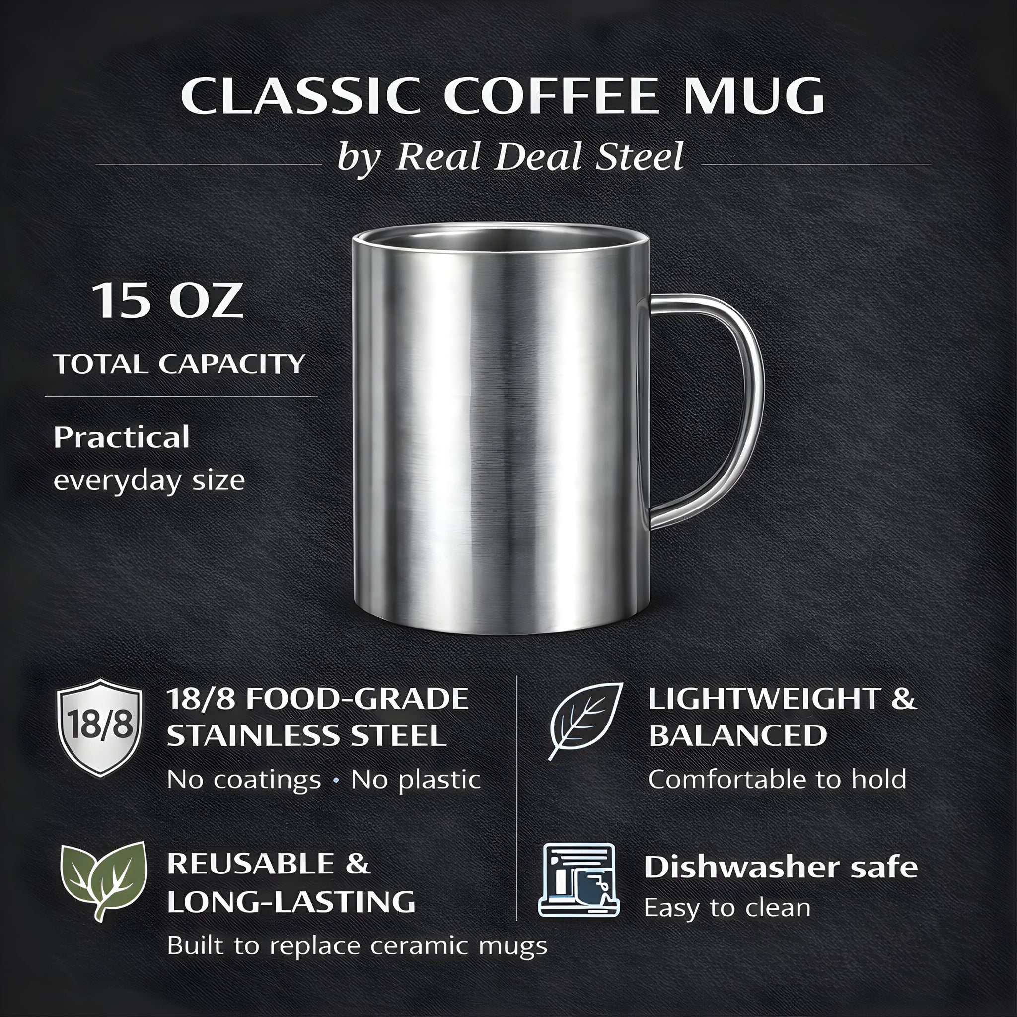 Made with unbreakable, lighweight stainless steel. It's food safe, toxin-free, insulated and will never rust or smell. You'll enjoy your morning coffee and your evening tea even more with a Real Deal Steel Classic 15 oz mug.